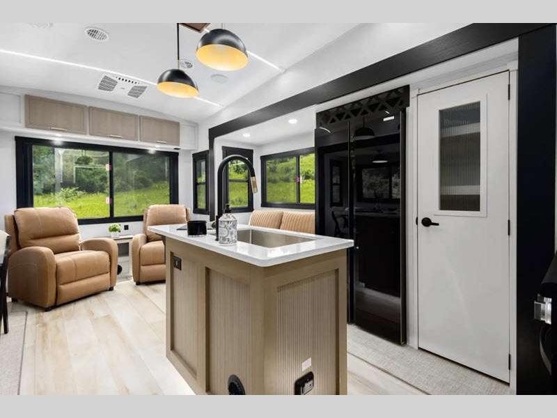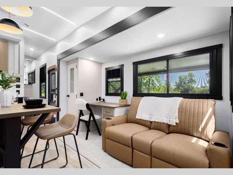 Sleeps 8 Slides 2 Length 37 ft 10 in Ext Width 8 ft Ext Height 13 ft 3 in Hitch Weight 1985 lbs Dry Weight 10064 lbs Cargo Capacity 3921 lbs Fresh Water Capacity 57 gals Grey Water Capacity 62 gals Black Water Capacity 30 gals Number Of Bunks 2 Available Beds Custom King Refrigerator Type 12V Refrigerator Size 16 cu ft Cooktop Burners 3 Number of Awnings 1 Water Heater Type On Demand Tankless AC BTU 15000 btu TV Info LR 50" LED Smart TV Awning Info 9' 6" and 18' Electric with LED Lights Axle Count 2 Washer/Dryer Available Yes Shower Type Walk-In Shower Electrical Service 50 amp Similar Floorplans